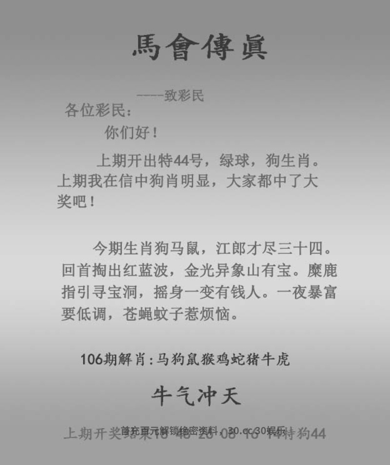 110期马会传真: 今期生肖猪鼠蛇,顺手牵羊三七来 六畜生肖出在牛,一三四头一定中 想要发财找三三,土木有号大家买 羊猪狗牛开特肖,十五月亮十六圆 虎虎生威 解:今期六畜生肖出在牛,解家禽生肖牛猪鸡羊狗马,十五月亮十六圆,解天肖兔马猴猪牛龙 综合:兔狗鼠猴虎龙马猪羊 六肖:兔狗鼠猴虎龙 |